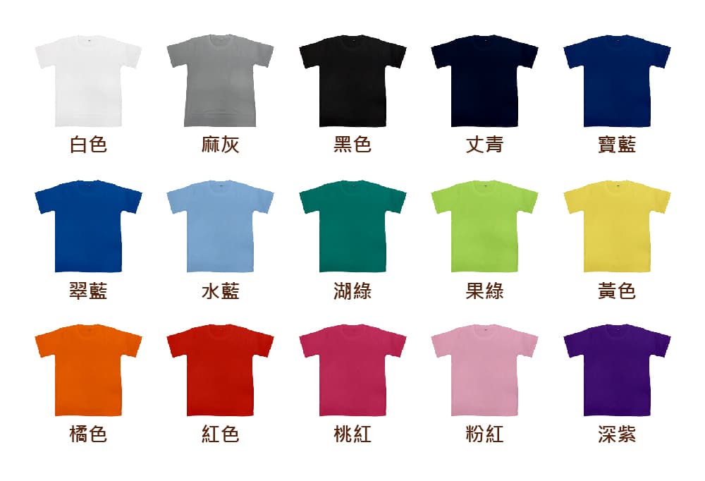 白色、麻灰、黑色、丈青、寶藍、翠藍、水藍、湖綠、果綠、黃色、橘色、紅色、桃紅、粉紅、深紫