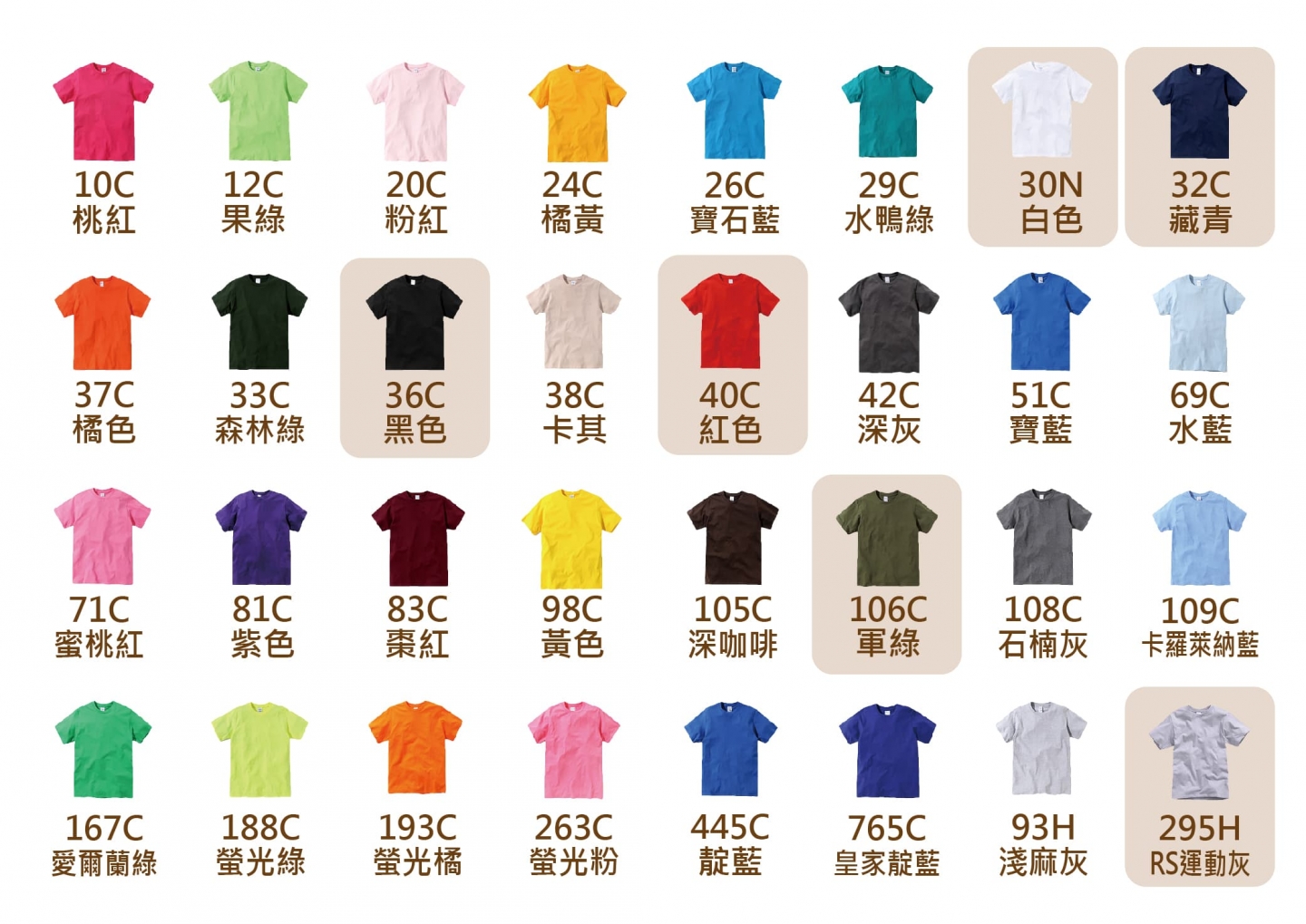 黑,白,灰色,淺灰,麻灰,深灰,深麻灰,無彩色,鮮豔色,馬卡龍色,淺藍,深藍,卡羅萊納藍,紅色,石楠色,紫色,深紫,螢光色,棗紅,暗紅,綠色,果綠,深綠,螢光綠,螢光橘,橘色,黃色,橘黃,芒果黃,粉紅色,粉色,桃紅色,蜜桃紅,卡其,藏青,丈青,寶藍,寶石藍,軍綠,深咖啡,螢光粉紅,石楠灰,靛藍